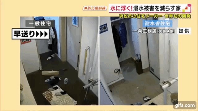Theo nh mi y, mt nh pht trin nh ca Nht Bn (cng ty Ichijo Komuten) thu ht s ch ca gii chuyn mn khi tuyn b tm ra gii php gi cho nh ca ngi dn khng b ngp lt cng nh b l cun tri, k c khi nc dng cao, sau khi c mt "ngi nh chng l" khng ch c th chng thm m cn ni lnh bnh trn mt nc. D bn c quan tm n tnh trng bin i kh hu trn Tri t hay khng, th vic mt nh do l lt l mt vn khng th ph nhn khp th gii. Mc d cc nh nghin cu v kin trc s ang c gng tm ra gii php gim ti a thit hi do thin tai, nhng rt t cng trnh em li hiu qu thc t. Mi y, mt nh pht trin nh ca Nht Bn (cng ty Ichijo Komuten) thu ht s ch ca gii chuyn mn khi tuyn b tm ra gii php gi cho nh ca ngi dn khng b ngp lt cng nh b l cun tri, k c khi nc dng cao. Ngi nh t ng ni khi nc dng.