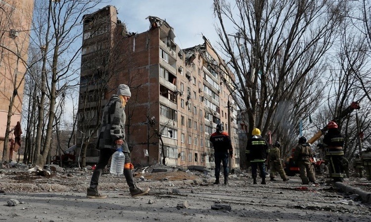 Một tòa nhà dân cư bị hư hại do pháo kích ở Donetsk, Ukraine, hồi tháng ba. Ảnh: Reuters.