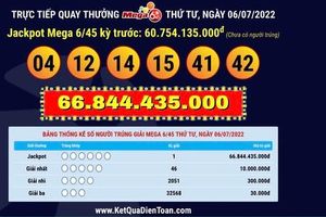 Cuối ngày 6-7, Công ty Xổ sổ điện toán Việt Nam (Vietlott) công bố tại kỳ quay số chiều cùng ngày, có 1 vé loại hình Mega 6/45 trúng giải Jackpot trị giá 68,8 tỉ đồng.