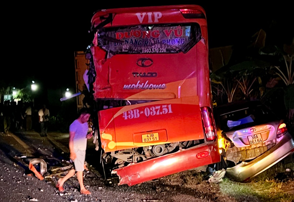 Tại hiện trường, xe container lao xuống vệ đường, đầu biến dạng, nằm nghiêng bên gốc cây. Phần đuôi và hông bên trái ôtô khách nứt toác, vỡ nát. Xe 5 chỗ hư hỏng nặng. Xung quanh nhiều mảnh vỡ bung ra, dầu đổ loang lổ.