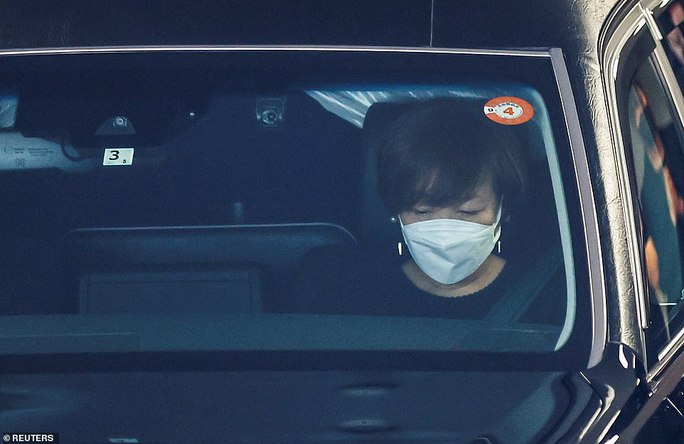 Bà Abe Akie ngồi ở ghế trước của chiếc xe tang, dường như chảy nước mắt. Ảnh: Reuters