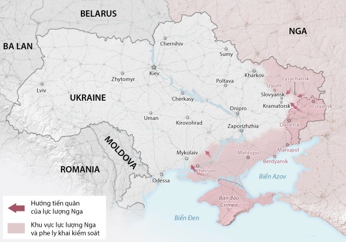Cục diện chiến trường Ukraine sau khi Nga kiểm soát Lysychansk. Đồ họa: Washington Post.
