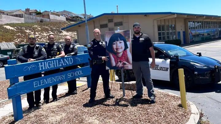 Sau khi có tin nghi can bị bắt, các cảnh sát viên tại Seaside đã đến trưng hình Anne Phạm bên ngoài trường tiểu học mà bé đã biến mất trên đường đến trường vào một sáng tháng Giêng năm 1982. (City of Seaside, California (Twitter)