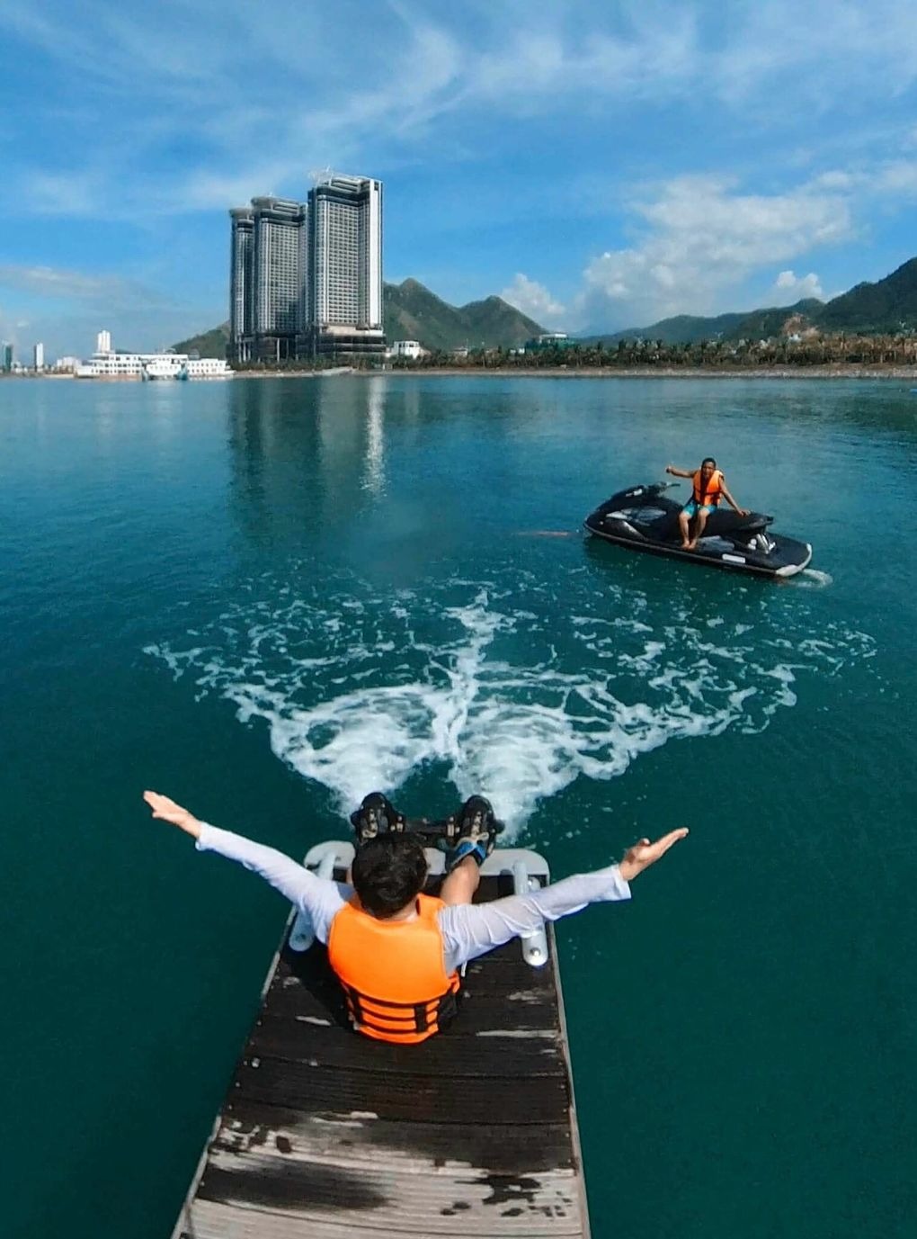 Người hướng dẫn moto nước luôn theo sát Hưng. Ảnh: NVCC
