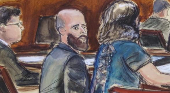 Bản phác thảo phòng xử án, Joshua Schulte (ở giữa) đang ngồi ở bàn bào chữa cùng các luật sư của ông trong các buổi thảo luận của bồi thẩm đoàn ở New York. Ảnh: AP