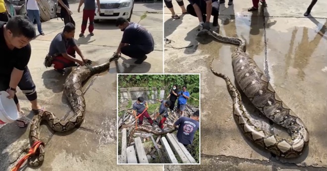 Video cho thấy cảnh những người có kinh nghiệm lôi con trăn khỏi hang ổ dưới các trụ bê tông cũ. Piyachat Charoensopha, một thành viên trong nhóm bắt trăn, nói: “Đây là một trong những con trăn lớn nhất mà tôi từng thấy. Nó có thể đã sống ở khu đất bỏ hoang này trong một khoảng thời gian, săn các động vật đi lạc”.