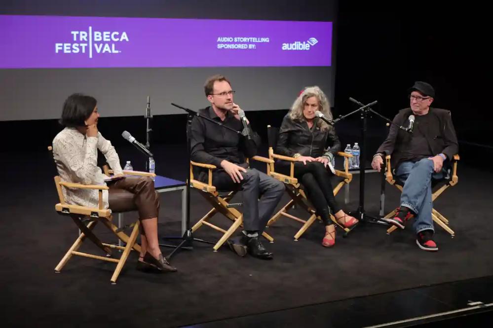 Ông Zayd Dohrn (thứ hai trái sang) cùng bố mẹ Bernardine Dohrn và Bill Ayers tại buổi ra mắt Mother Country Radicals ở New York