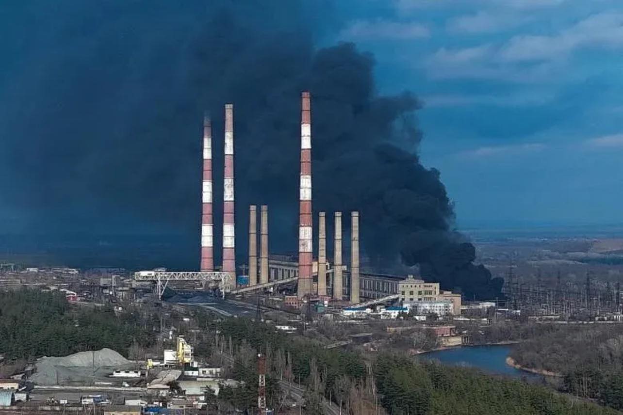 Khói bốc lên bao trùm nhà máy nhiệt điện Luhansk sau cuộc pháo kích của các chiến binh thân Nga gần thành phố nhỏ Schastye ở khu vực Luhansk, Ukraine. Ảnh EPA