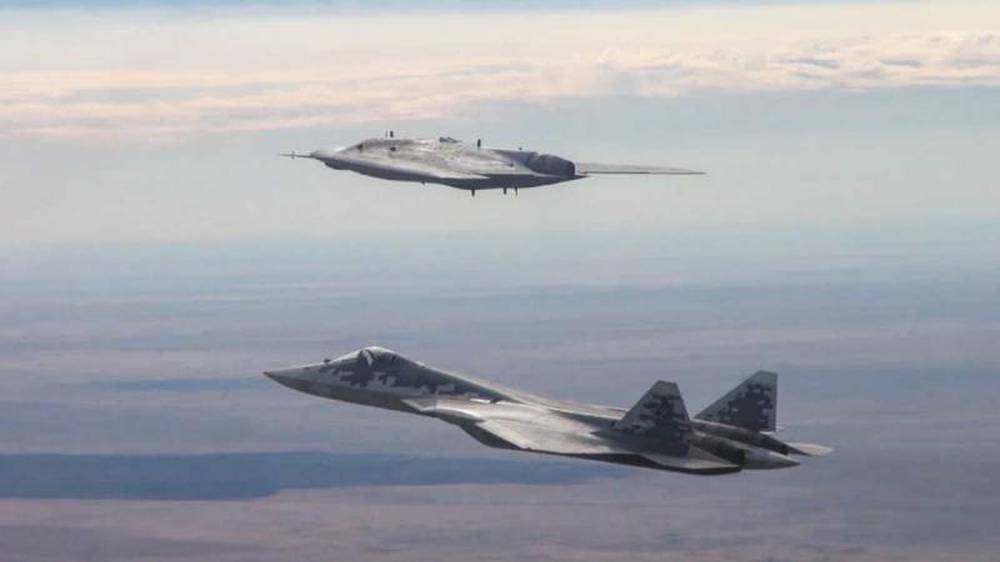 Nguyên mẫu UCAV Sukhoi S-70 Okhotnik-B bay bắt cặp với tiêm kích tàng h́nh Su-57.