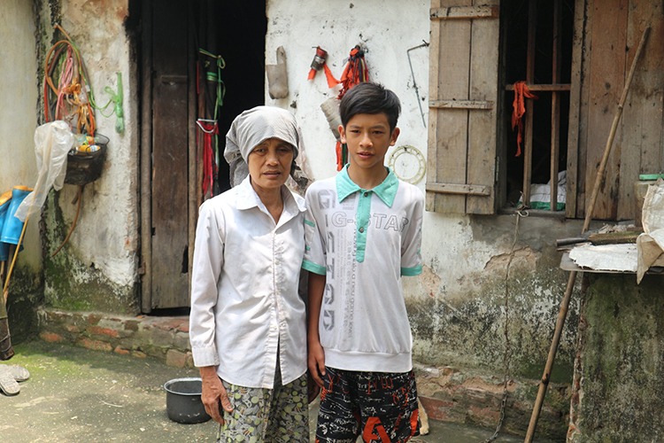 Bà Nguyễn Thị Bảnh và cậu con trai Nguyễn Như Huyến năm 2017, trước khi căn nhà được nhà nước tu sửa, chống dột nát. Ảnh: Quỹ Khát Vọng