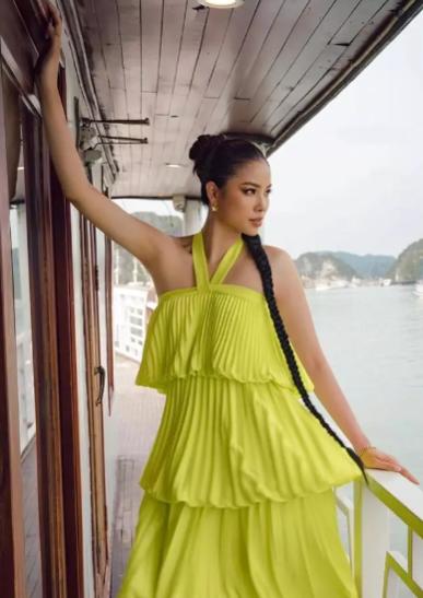 Tiếp theo, người đẹp đổi sang bộ váy màu xanh mang cảm giác tươi mát.. Nhìn phần eo săn chắc, nuột nà của Phạm Hương, không ai nghĩ cô đã là bà mẹ hai con. Điểm nhấn của outfit chính là đôi khuyên tai ngọc trai to bản.