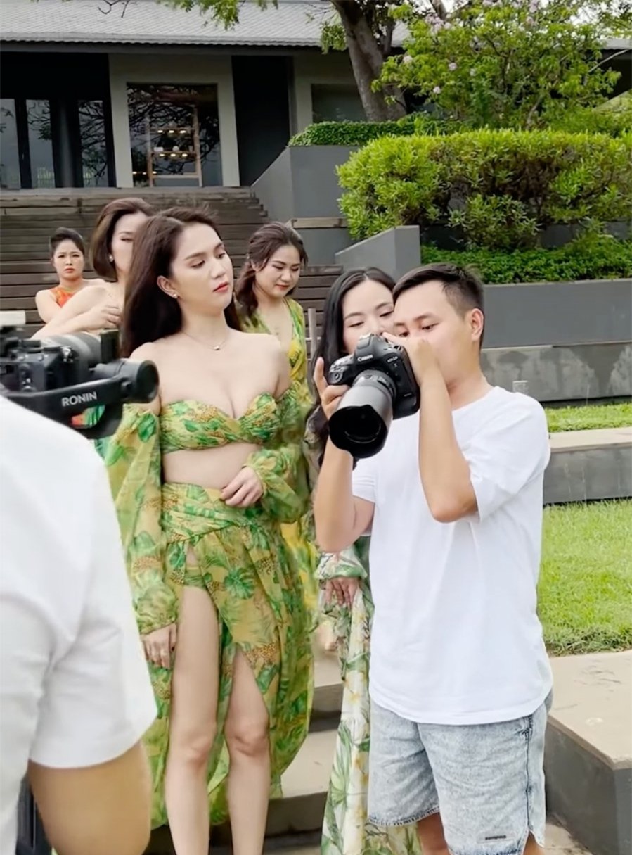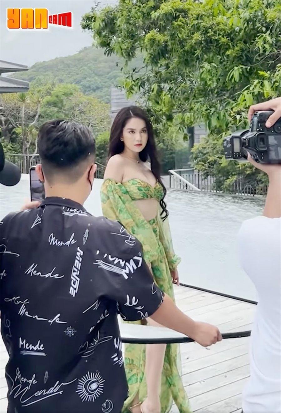 Ngọc Trinh đang "xả dáng" nhưng khi có máy quay hướng đến là thay đổi biểu cảm, tạo dáng chuyên nghiệp ngay.