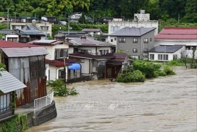 Mưa lớn gây ngập lụt nhiều khu dân cư tại Yamagata, Nhật Bản, ngày 4/8/2022. Ảnh: Kyodo
