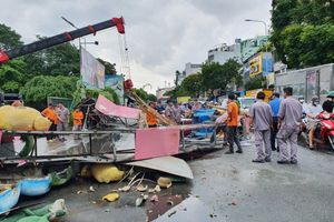Cơ quan chức năng quận 11 đă điều xe cẩu đến xử lư hiện trường. Đến 14h45, cổng chào đă được thu dọn xong, giao thông qua khu vực b́nh thường trở lại.