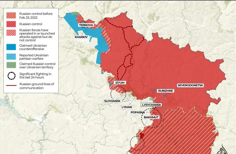 Ở Kharkiv (tỉnh miền đông bắc Ukraine), quân đội Ukraine tuyên bố tái kiểm soát thị trấn Dovhenke từ Nga và đang tổ chức phản công ở Izium.