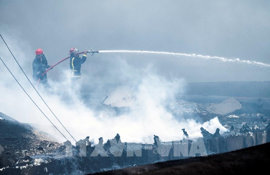 Lính cứu hỏa nỗ lực dập lửa tại hiện trường vụ cháy kho chứa nhiên liệu lớn nhất Cuba trên Vịnh Matanzas, ngày 9/8/2022. Ảnh: AFP/TTXVN