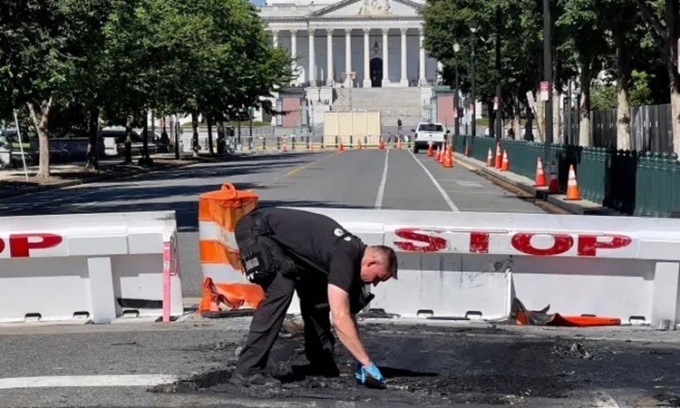 Cảnh sát kiểm tra hiện trường vụ lao xe vào rào chắn gần Đồi Capitol ở thủ đô Washington, Mỹ, ngày 14/8. Ảnh: AFP.