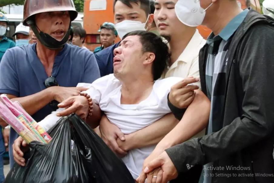 Có mặt tại hiện trường khi thi thể vợ con được đưa ra ngoài, anh Đặng Đình Hùng (38 tuổi) khóc ngất, được người nhà dìu lên xe đưa đến bệnh viện. Anh Hùng bị bỏng và may mắn thoát ra khỏi nhà khi đám cháy bùng phát.