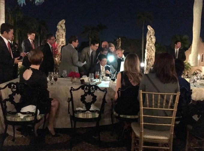 Thế nhưng, hình ảnh do khách dự tiệc ở Mar-a-Lago đăng trên mạng xã hội cho thấy lãnh đạo hai nước đã bày nhiều tài liệu trên bàn ăn. Các trợ lý ngồi cùng họ, làm việc trên máy tính xách tay, trong khi ông Trump trao đổi bằng điện thoại di động cá nhân. Phụ tá của hai lãnh đạo phải bật đèn flash trên điện thoại để họ đọc tài liệu.