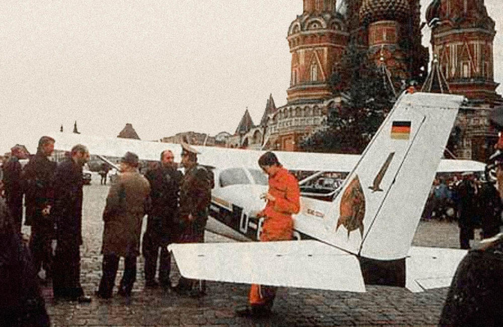 Quảng trường Đỏ ở Moskva, 18 giờ tối 28/5/1987, như thường lệ vẫn là nơi tham quan, dạo chơi ưa thích của khách du lịch và nhân dân địa phương. Đội danh dự gác Lăng Lenin chuẩn bị đổi ca. Khoảng 300 người có mặt tại đây chợt nghe tiếng động cơ, sau đó họ thấy bóng của một máy bay lướt qua đầu với vận tốc rất thấp rồi đáp xuống khoảng trống giữa bức tường Kremli và nhà thờ St. Basil. Đám đông hiếu kỳ chạy tới vây quanh chiếc máy bay. Một thanh niên trạc tuổi đôi mươi đeo kính đen, mặc áo bu dông màu đỏ bước ra khỏi máy bay. Đó chính là Mathias Rust, kẻ vừa may mắn thoát khỏi sự “kèm cặp” của 2 chiếc tiêm kích Su-15. Rust giới thiệu với mọi người mình là người Đức, vừa bay từ thủ đô Helsinki của Phần Lan tới, sau đó phát ảnh có chữ ký của mình cho mọi người. Tuy nhiên, câu chuyện giữa họ chỉ kéo dài được vài phút bởi sự xuất hiện của các nhân viên an ninh và khoảng 2 giờ đồng hồ sau, Rust bị áp giải vào phòng điều tra của Cơ quan an ninh liên bang (KGB).