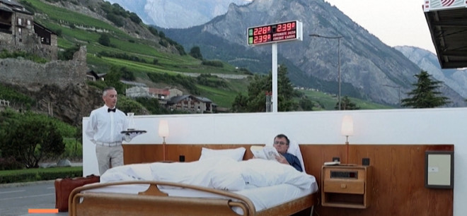 Hai anh em người Thụy Sĩ đã đưa ra một phiên bản 'bất thường' của một khách sạn không có phòng, chỉ có một chiếc giường đôi. Năm nay, "khách sạn" này nằm trên một con đường bên cạnh một trạm xăng dầu ở làng Saillon, ở bang phía nam của Valais, Thụy Sĩ, nằm gần một tấm biển hiển thị giá xăng và có xe ô tô chạy qua.