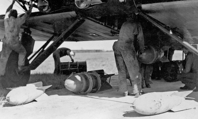 Kỹ thuật viên Mỹ gắn bom lên các oanh tạc cơ trước chiến dịch ném bom siêu núi lửa Mauna Loa ngày 27/12/1935. Ảnh: NY Times.