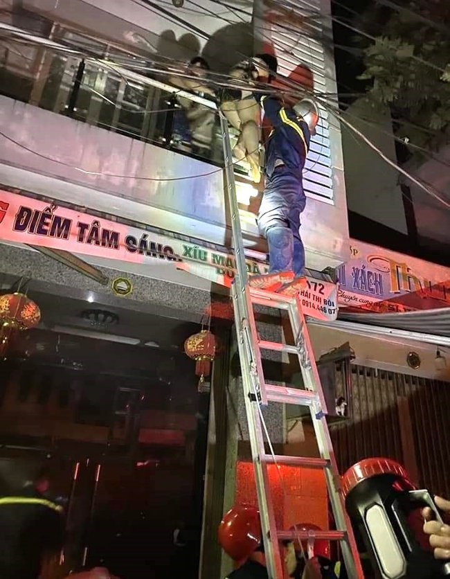 Lực lượng chức năng giải cứu 4 người bị mắc kẹt trên tầng 2 trong ngôi nhà tại Đà Nẵng bốc cháy lúc rạng sáng. Ảnh: LLCC