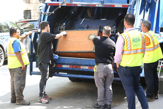 Các nhân viên dọn dẹp bỏ các vật dụng dọn từ nhà bà Ivana lên xe rác ở New York ngày 24/8. Ảnh: NYP