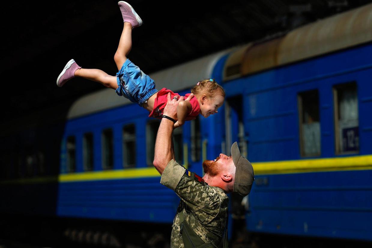 Một người lính Ukraine vui đùa cùng con gái của ḿnh tại ga đường sắt Lviv, Ukraine. Ảnh Getty
