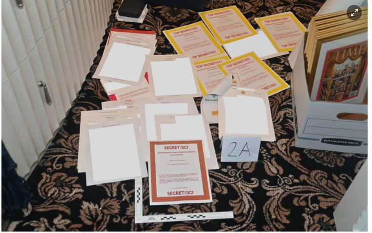 Cùng ngày, Bộ Tư pháp Mỹ đã công bố ảnh chụp nhiều tài liệu “mật” hoặc “tuyệt mật”, được bày ra trên sàn dinh thự Mar-a-Lago, sau cuộc khám xét của FBI. Qua đó, cơ quan này cho rằng đã có những hành động che giấu hoặc tiêu hủy tài liệu nhằm cản trở công tác điều tra.