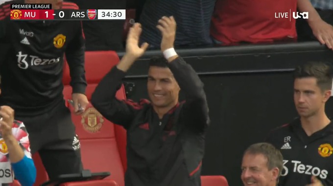 Ronaldo đứng bật dậy vui vẻ vỗ tay sau khi Antony mở tỷ số cho Man Utd trong trận thắng Arsenal 3-1 ngày 4/9. Ảnh: chụp màn hình