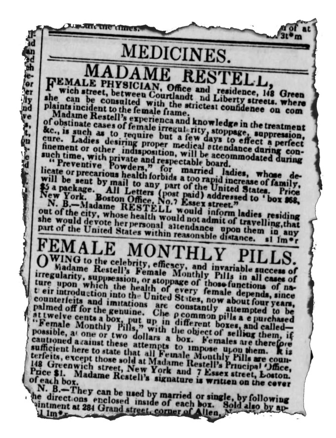 Lần đầu tiên Restell quảng cáo dịch vụ với tư cách là bác sĩ trên tờ New York Sun vào ngày 18/3/1839. Với sự giúp đỡ của chồng, Restell đã quảng cáo tràn lan trên các mặt báo của New York Herald và New York Times.