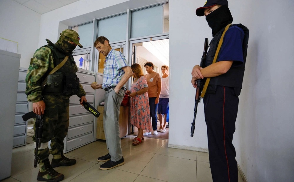 Binh sĩ Nga kiểm tra an ninh với cư dân Kherson tại một trụ sở của Bộ Nội vụ. Ảnh: Reuters.