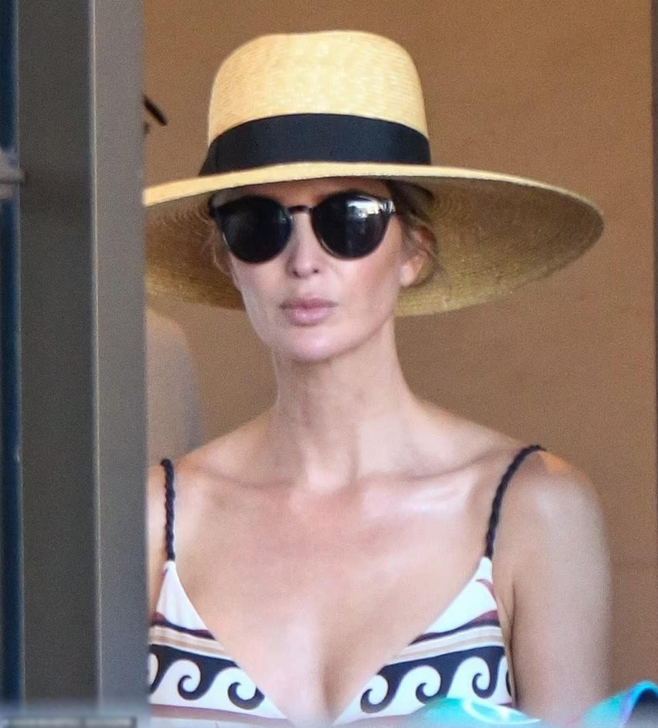 Trong khi đó, Ivanka mặc bikini một mảnh và quần short màu trắng, lúc thì đội mũ lưỡi trai, lúc lại đổi mũ rộng vành.