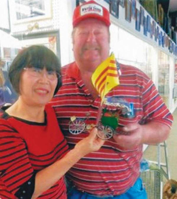 Một người đàn ông Á Châu bước ra khi chúng tôi vào. Giám đốc Dann ngồi trước một cái bàn dài chất ngổn ngan đầy những kỷ vật. Ông nói người đàn ông vừa rồi là người Hmong, đem tặng những kỷ vật từ cuộc chiến Việt Nam mà ông ấy từng tham dự. “Cậu bé Dann” mà tôi muốn gặp là một người đàn ông cao lớn, mặt đỏ hồng như tượng ngài Quan Công, nhưng nhìn rất hiền lành thân thiện. Tôi kể chuyện bà Mary giới thiệu, ông tỏ ra vui lắm. Nhà tôi lấy chiếc xích lô ra và nói: