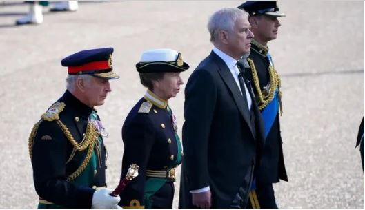 Trái với 3 người con còn lại của Nữ hoàng Elizabeth II, đều mặc quân phục trong lễ tang tại Edinburgh, Hoàng tử Andrew đã xuất hiện trong bộ âu phục.