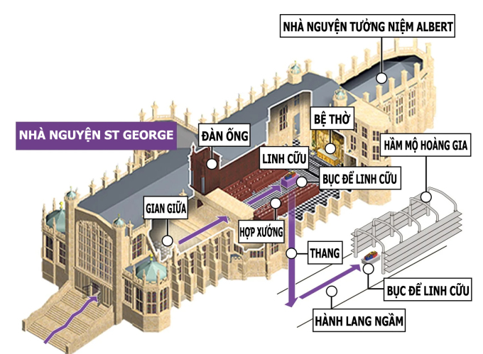 Hầm mộ nơi 25 thành viên hoàng gia Anh an nghỉ. Linh cữu Nữ hoàng Elizabeth II sẽ được chuyển xuống hầm mộ trong Nhà nguyện St George, nơi 25 thành viên Hoàng gia Anh đang an nghỉ sau tang lễ.