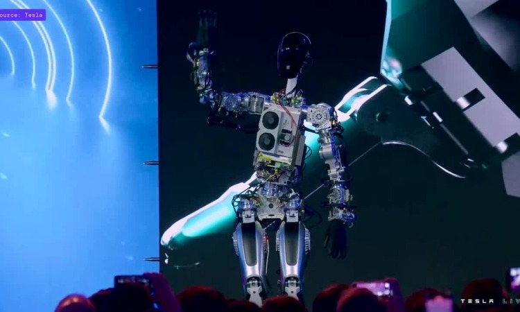 Optimus, robot hình người đầu tiên của Tesla, có thể di chuyển trên sân khấu không cần dụng cụ đỡ, nhưng chức năng còn hạn chế.