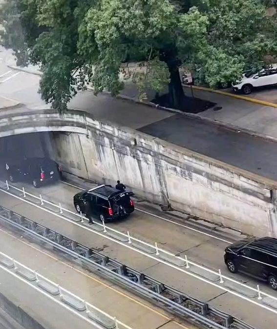 Hình ảnh cắt từ video được đăng tải trên mạng xã hội, được cho là quay sau vụ tai nạn xe hơi liên quan đến Phó Tổng thống Kamala Harris, cho thấy một đoàn xe ô tô dừng tại đường hầm và một số quan chức đang chạy vào bên trong đường hầm.