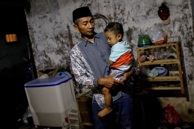 Andi Hariyanto bế cậu con trai hai tuổi tại nhà riêng ở Malang, tỉnh Đông Java, Indonesia, ngày 4/10. Ảnh: Reuters.
