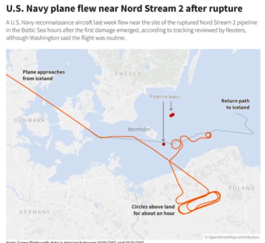 Dữ liệu các chuyến bay cho thấy một máy bay tuần tra và giám sát hàng hải P-8A Poseidon của Hải quân Mỹ đã bay qua Biển Bắc lúc 0 giờ 3 phút (giờ địa phương) vào ngày 26-9, thời điểm Thụy Điển thông báo về vụ nổ dưới biển ở phía Đông Nam đảo Bornholm trên biển Baltic.