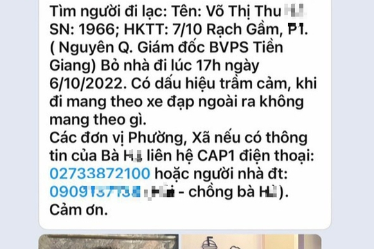 Trước đó, vào tối 6-10, người thân bà H. đến Công an phường 1, TP Mỹ Tho trình báo bà H. đã đi khỏi nhà vào lúc 17 giờ cùng ngày. Khoảng 2 giờ sau, người dân phát hiện một chiếc xe đạp bỏ trên cầu Rạch Miễu.