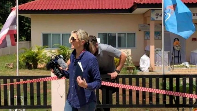Nữ phóng viên CNN trèo hàng rào rời hiện trường vụ thảm sát ở nhà trẻ Thái Lan ngày 6/10. Ảnh: Australian.