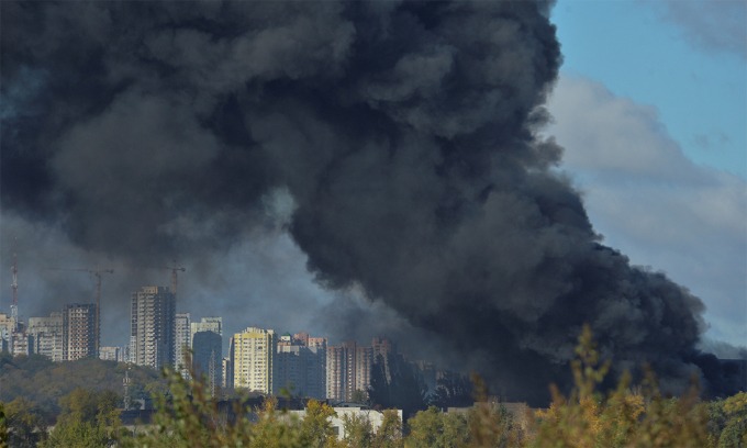 Khói bốc lên từ một khu vực trúng tên lửa Nga tại thủ đô Kiev, Ukraine ngày 10/10. Ảnh: Reuters.