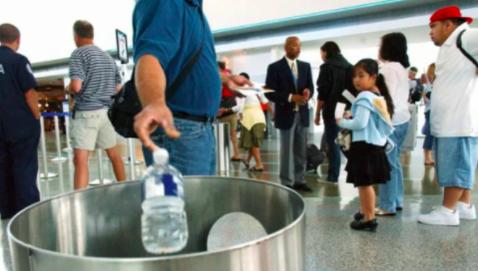 Một hành khách vứt chai nước trước cửa soi chiếu hành lý tại sân bay. Ảnh: AP