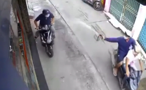 Được biết, lúc này một người đàn ông đang dừng xe trong hẻm để nhắn tin điện thoại. Hình ảnh camera an ninh được chia sẻ lên mạng cho hay, nhóm cướp giật 4 người đi trên 2 xe khi lướt qua, đã thấy “con mồi” nên chúng quay xe lại.