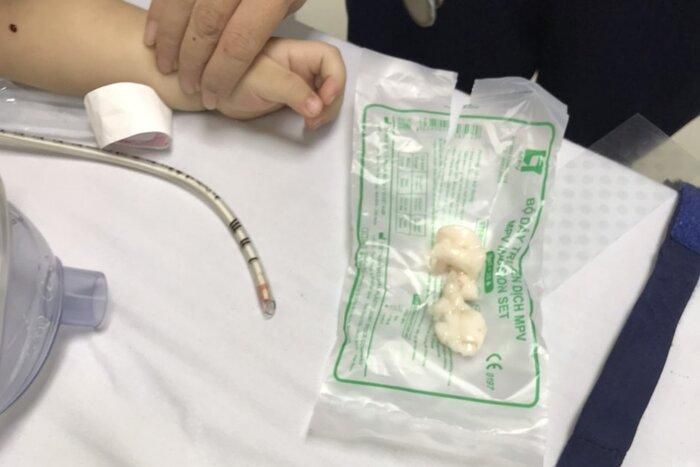 Các bác sĩ lấy dị vật là thạch rau câu ra khỏi cơ thể bệnh nhi. (Ảnh: VNN).