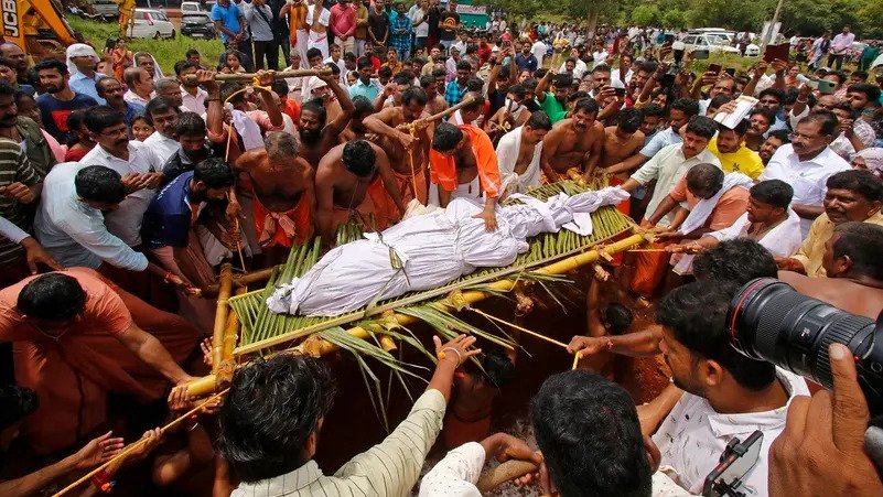 Xác cá sấu được đính nhiều hoa và được ban phước trước, sau đó rước qua đám đông người dân tới tiễn đưa con vật rồi chôn trong khuôn viên đền Sri Ananthapadmanabha Swamy, theo AFP.