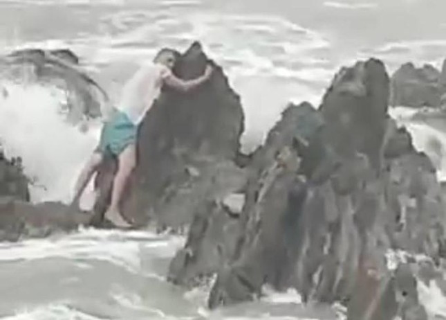 Người đàn ông mải mê chụp ảnh bị sóng biển cuốn ra xa nhưng đã bám được vào tảng đá nhô cao. Ảnh cắt từ clip.