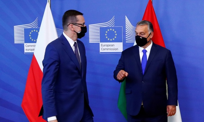 Thủ tướng Ba Lan Mateusz Morawiecki (trái) và Thủ tướng Hungary Viktor Orban ở Brussels, Bỉ, hồi tháng 9/2020. Ảnh: Reuters.